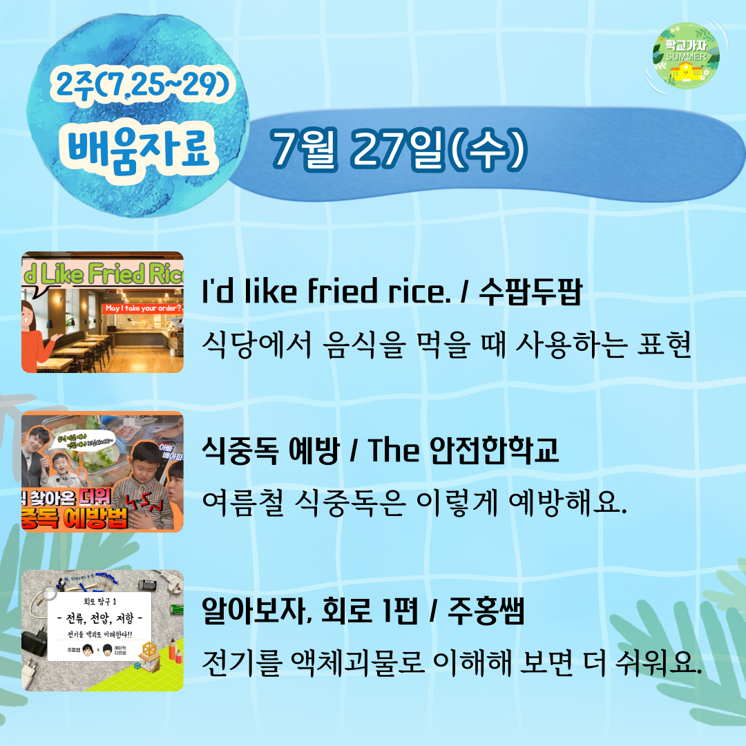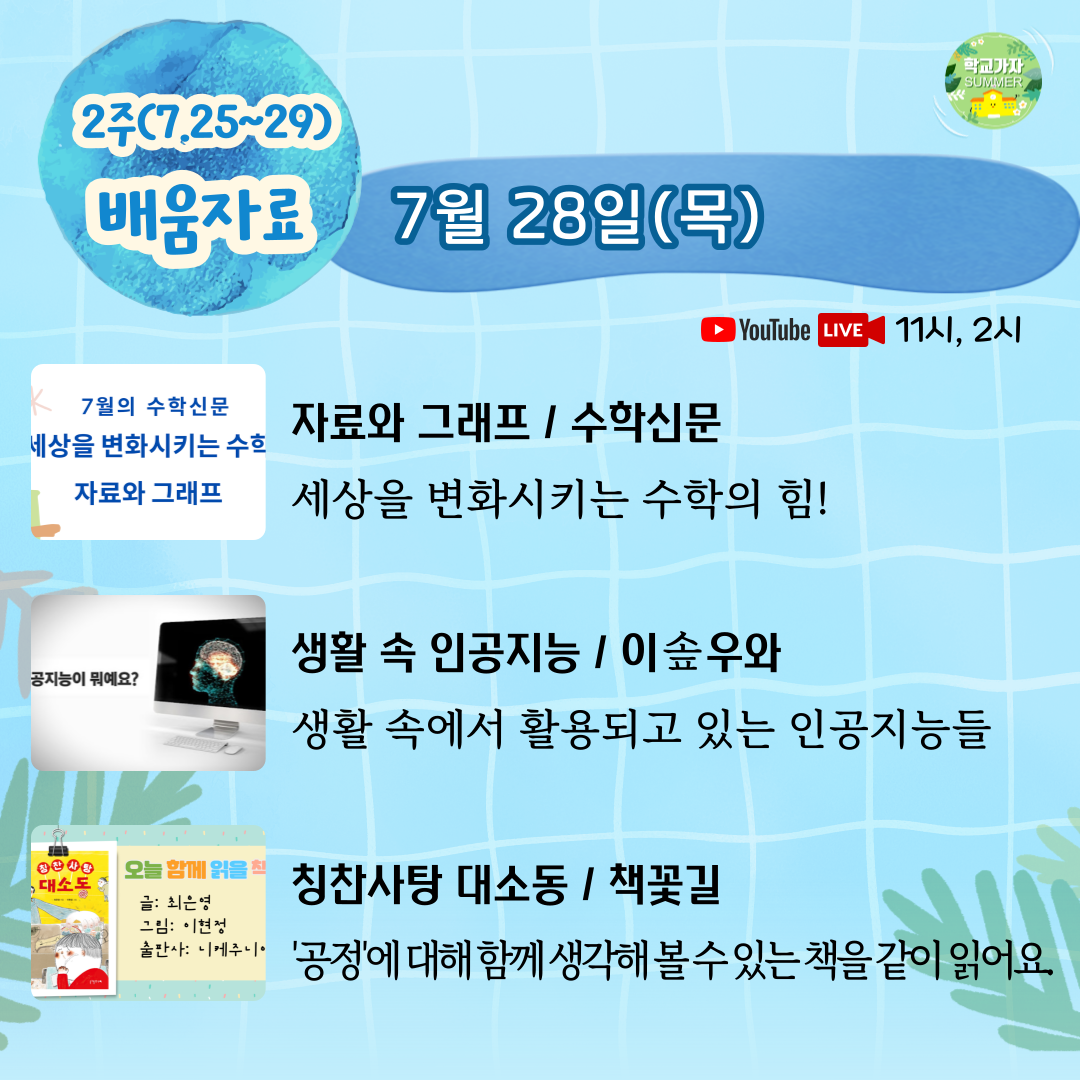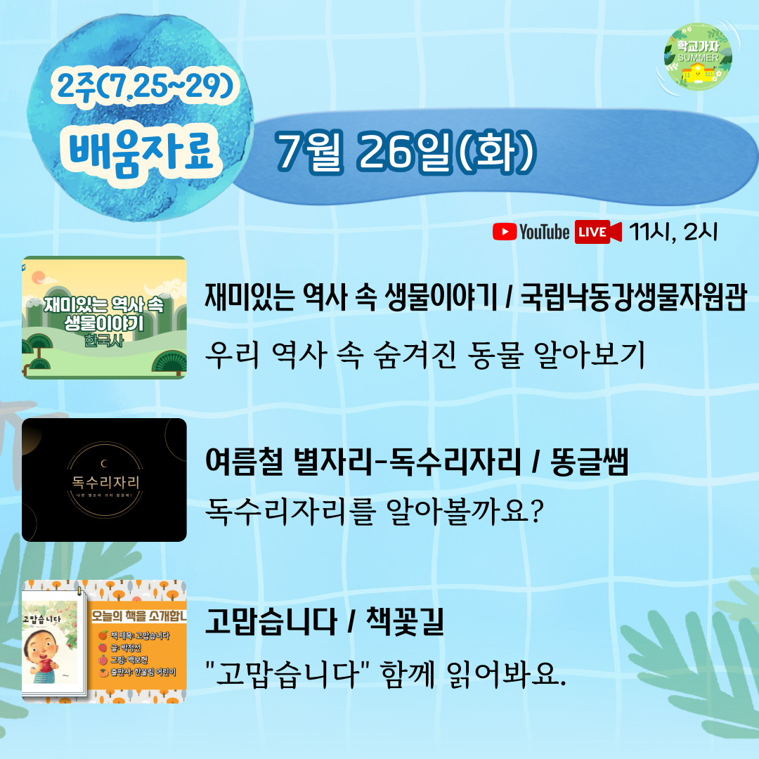 이번 주와 다음 주 화요일과 목요일 각각 오전 11시와 오후 2시에 '실시간 온라인 여름방학교실' 라이브 방송도 기대해 주세요!