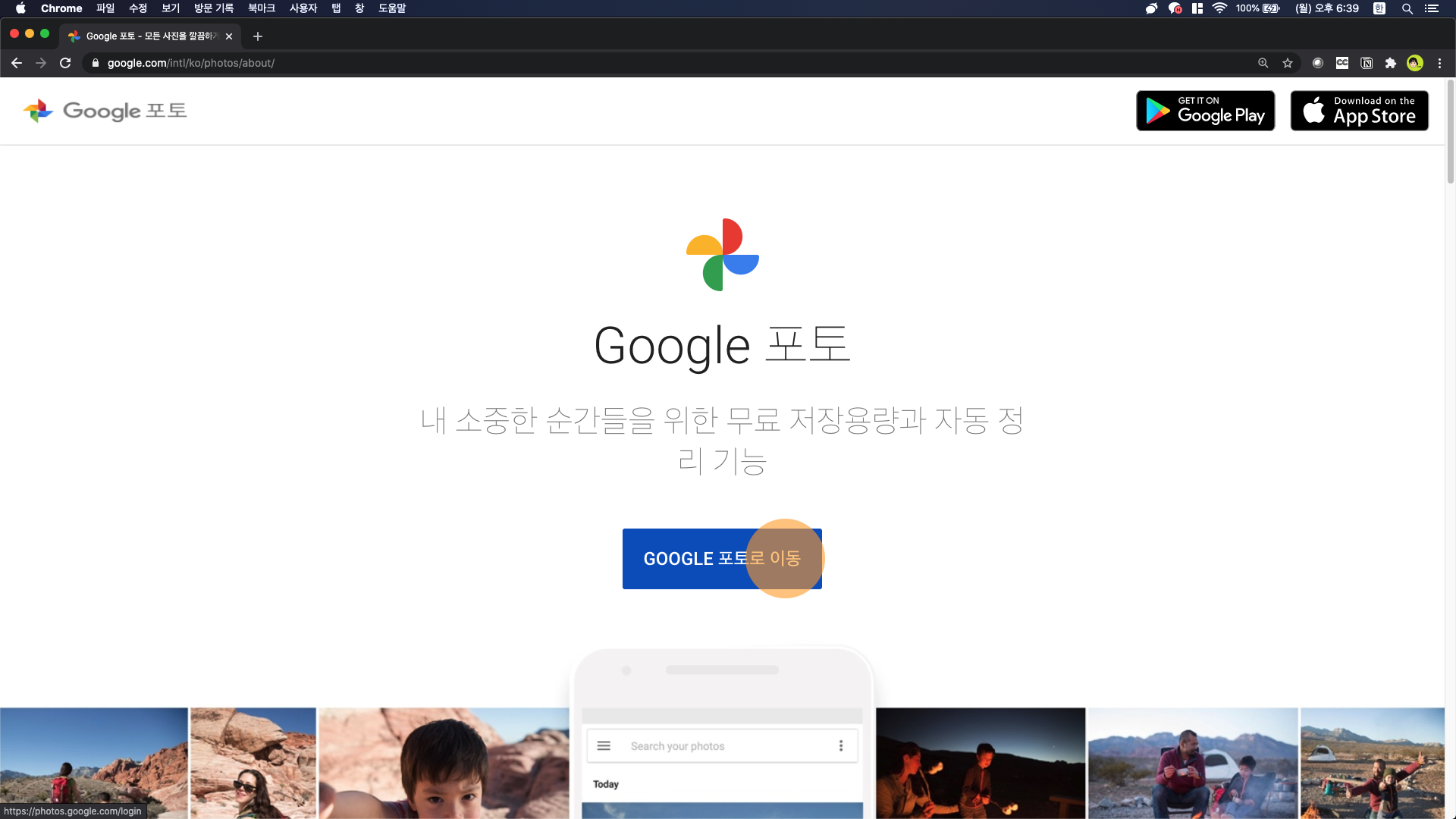 첫 번째로 나오는 주소로 들어간 뒤(www.google.com/photos/about/), 다음 화면에서 가운데의 GOOGLE 포토로 이동 버튼을 누릅니다.
