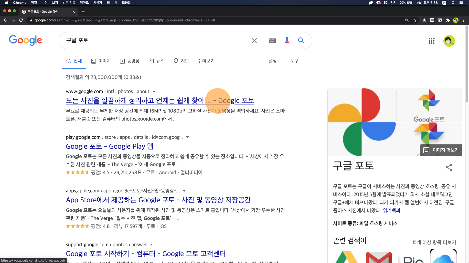 크롬을 사용하고 있다면, 오른쪽 상단에 '이미지'와 프로필 사진 사이의 점 9개 버튼을 클릭합니다. 하단으로 이동하여 사진을 클릭합니다.