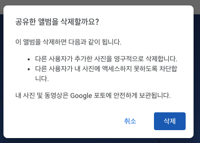 - 앨범 삭제: 앨범을 삭제합니다. 이 경우, 위의 화면과 같이 다른 사용자가 추가한 사진이 나의 구글 포토에서 영구적으로 삭제되고, 내가 올린 사진에 대한 다른 사용자의 접근 권한도 없어집니다.